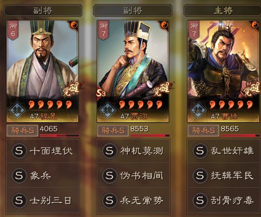 曹操 +【刮骨疗毒】+【兵无常势】:曹操的生存能力强无须担心,学习兵无常势的武将可奶自己,那刮骨疗毒大概率就会指向性的奶没有兵无的那个武将,通常是队伍的核心。