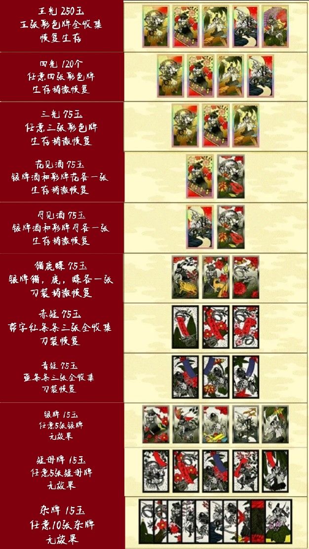 首先就是我放在封面的这张图,是每个牌组(役)凑齐以后能获得的玉的数量以及达成役以后能获得的效果(恢复刀装或者恢复生存)