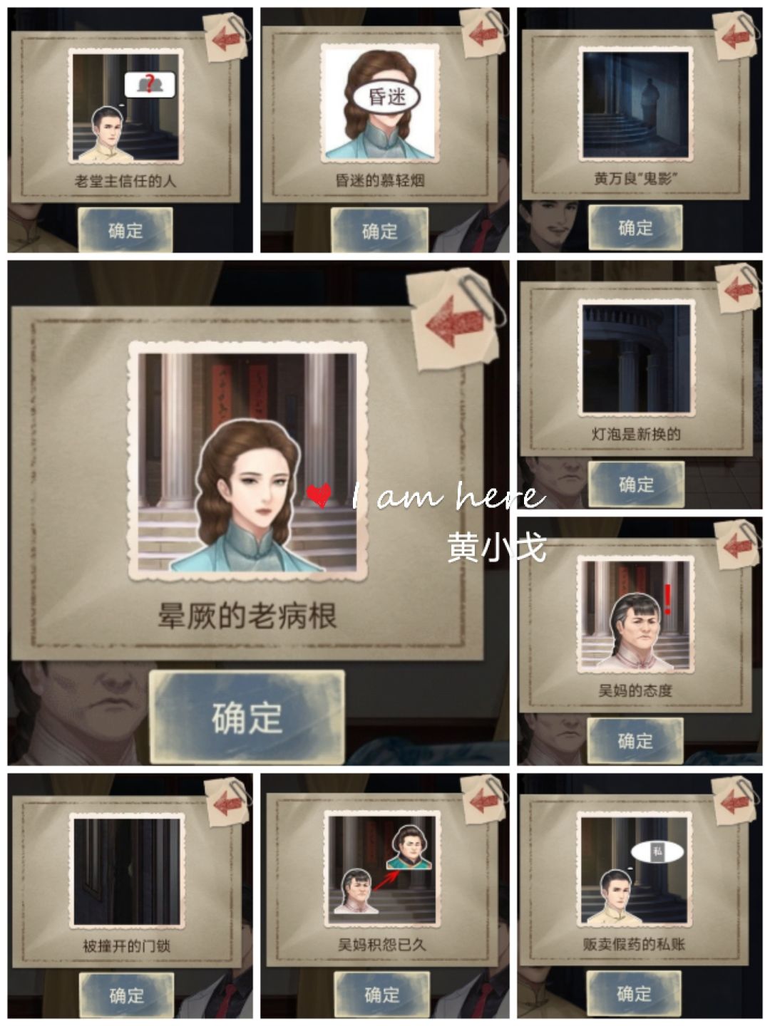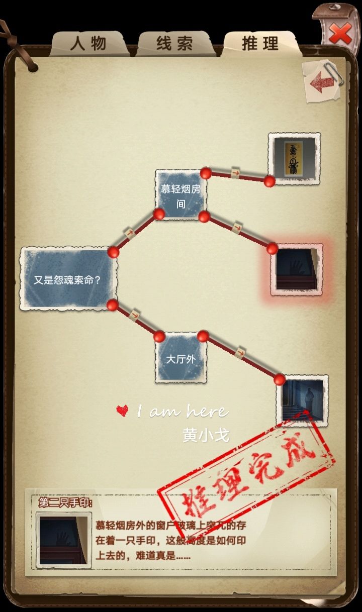 ⑴又是怨魂索命?→⑴慕轻烟房间→【奇怪的书法】、【第二只手印】,⑵大厅外→【黄万良“鬼影”】