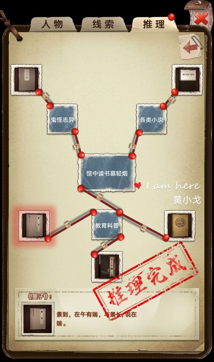 馆中读书慕轻烟→⑴鬼怪志异←【子不语】,⑵→各类小说←【福尔摩斯集】,⑶→教育科普←【墨子】、【天工开物】、【半农谈影】