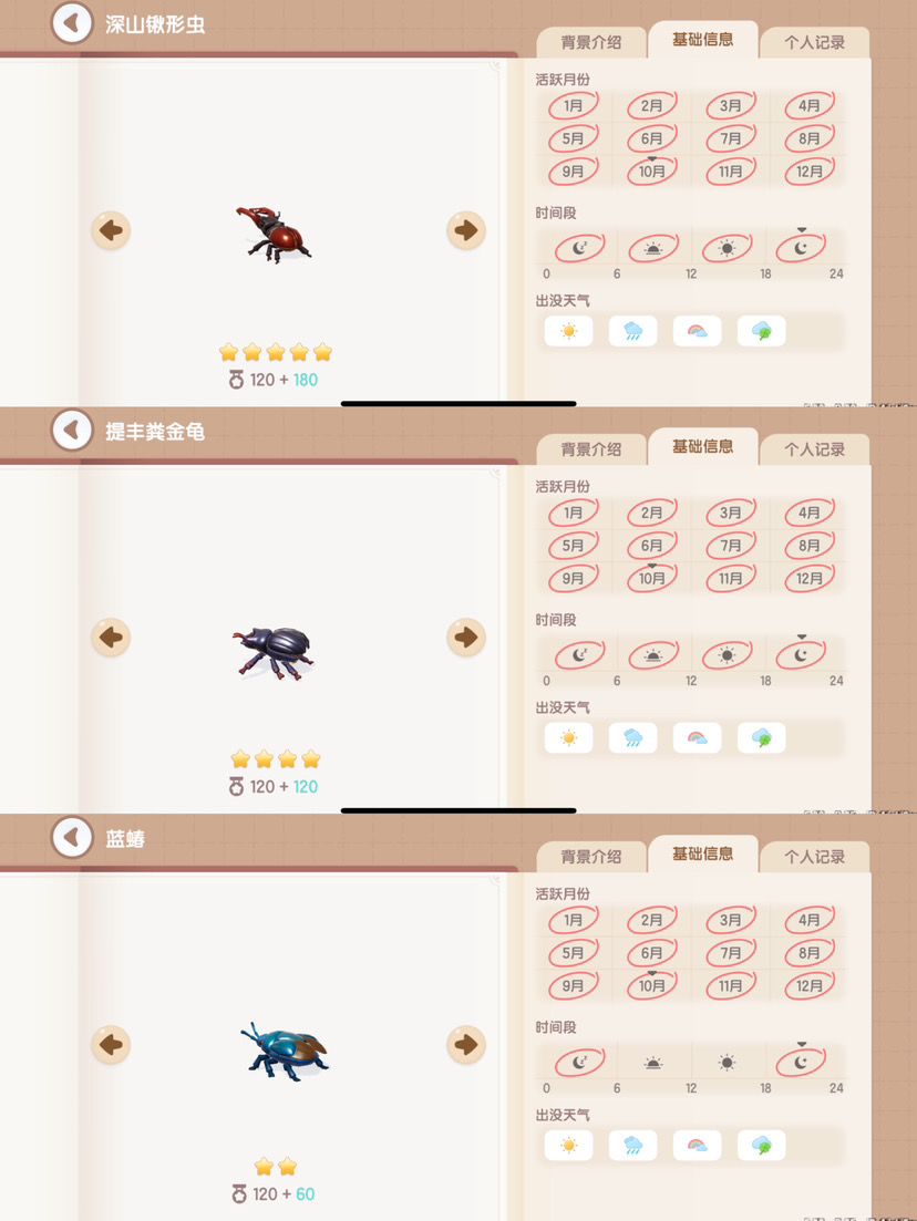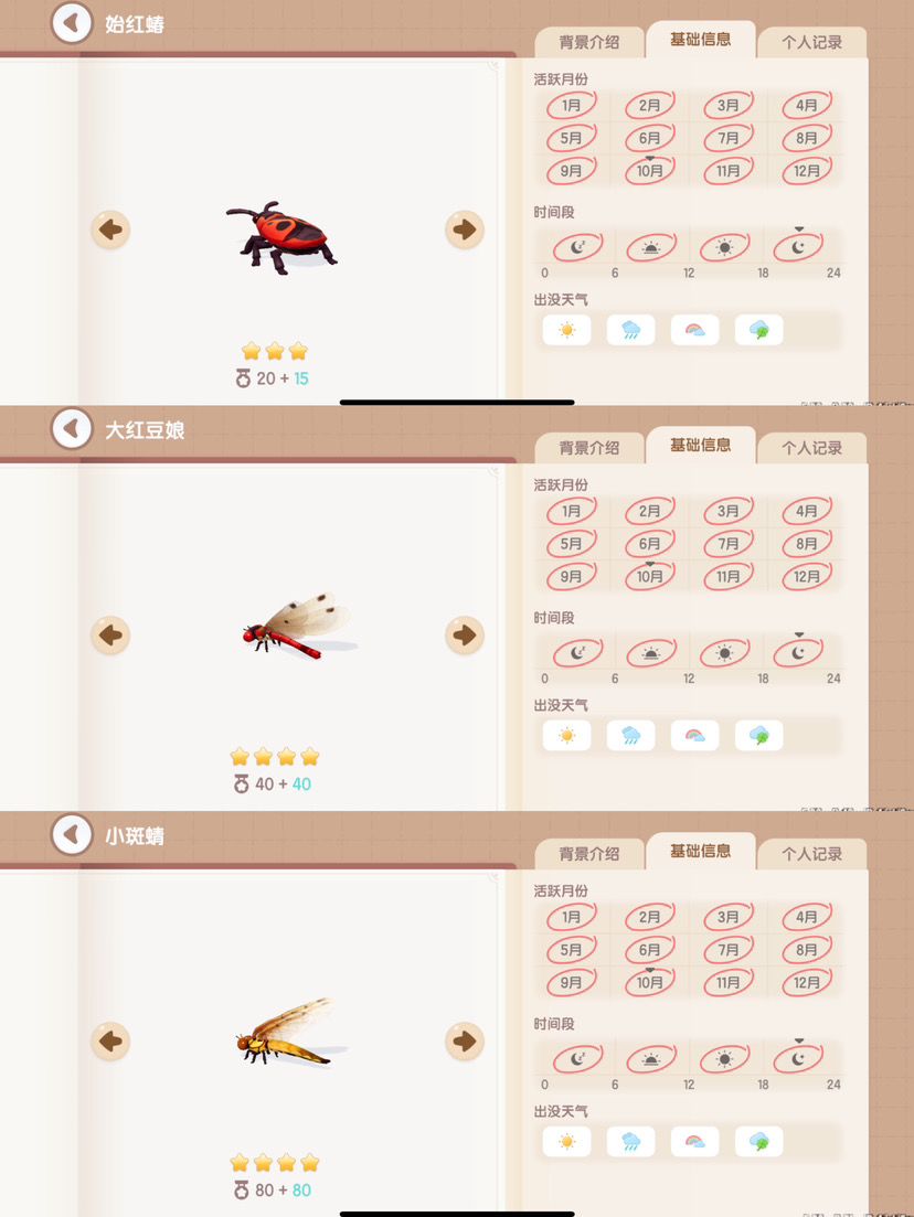 3.甲虫:6只,带壳的虫子。大部分出现在草丛,土路,石头顶上,“始红蝽”在初级石头上面的小红点。还有个别比较难捕的,例如“深山锹形虫”,它在树根上出现,偶尔棕色岩石上面也会出现,最好是直接跑过去瞄准直接捕