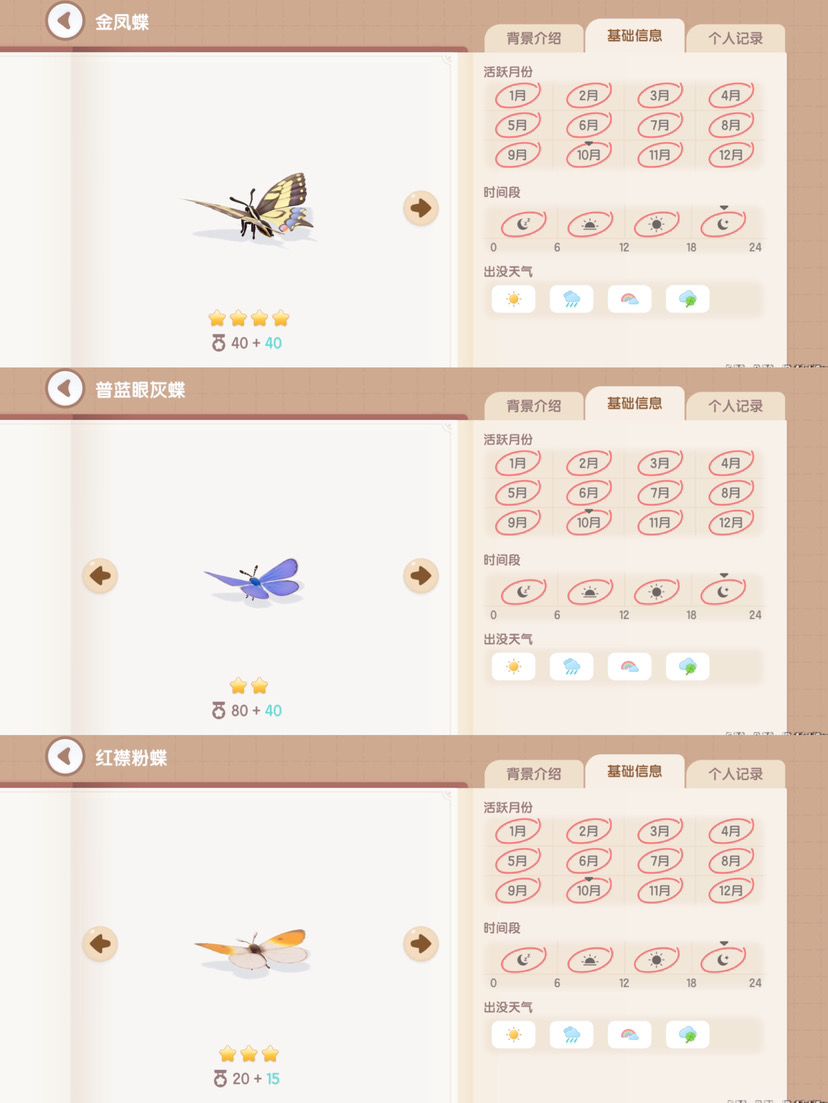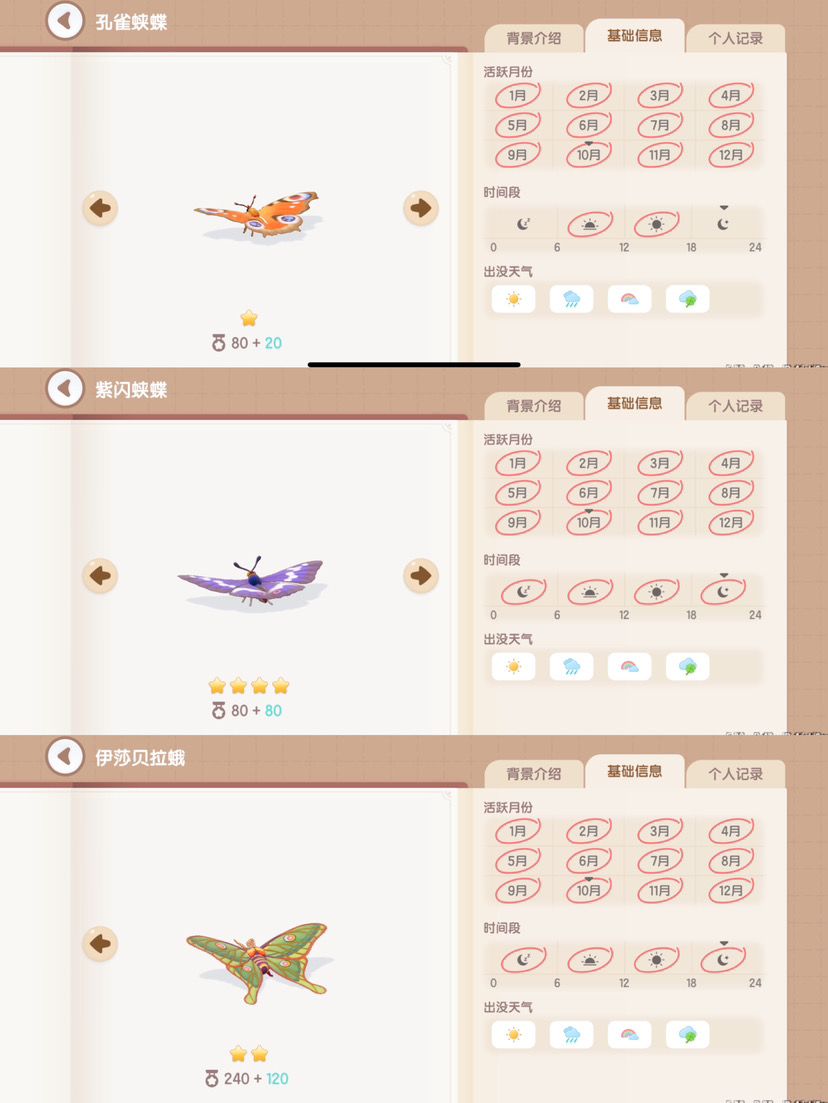 捕虫图鉴:共20只,大致分5类:1.蝴蝶:7只,在捕捉中会一直飞不会消失,平时做任务跑图时,看见了随手捕捉就行!很容易遇到(除“伊莎贝拉蛾”)