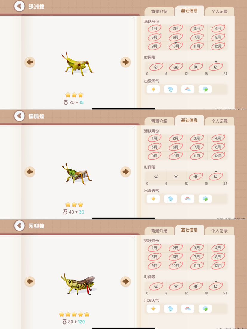 4.蝗虫:3只。基本出现在草丛或者土地上,比较好捕,跳的距离有些远。其中“网翅蝗”在石头山那边,红色花草那,它在那里翻草,快速跑过去把它吓出来直接捕就好了