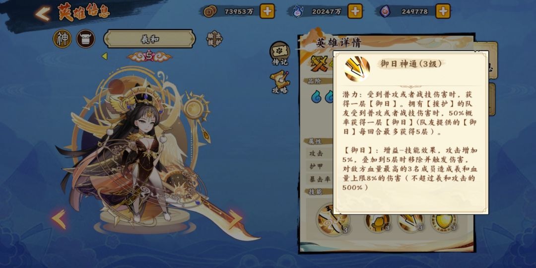 攻击用:御日,神技啊,比梨花强大在这,攻击有技能加,伤害杠杠滴!跟后羿的羽箭是一个套路,不愧是一伙的!还跟援护有联动,稳稳的叠层数