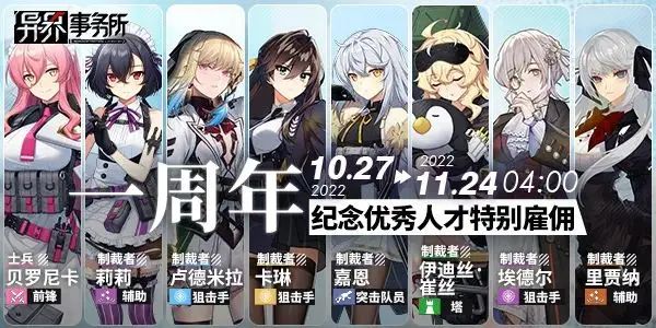将与ta相遇在一周年的宴会!一周年纪念优秀人才特别雇佣卡池,共160次的免费雇佣将在本周四更新维护后开放。纪念卡池开放期间内,老板每日可得到10次免费雇佣机会(即1次10连雇佣或者10次单次雇佣),共计16日的雇佣共可得到160次的免费雇佣。纪念卡池上线期间内,雇佣次数可累积至一次或多次消耗,160次消耗完后卡池关闭。