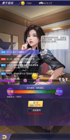主线剧情是产出金币、金块、营销点数的主要场所,我们在关卡BOSS前增加了额外的宣传玩法,玩家可以通过点击“宣传”,消耗一定数量的现金换取金币,金币可用来提升主播的等级。