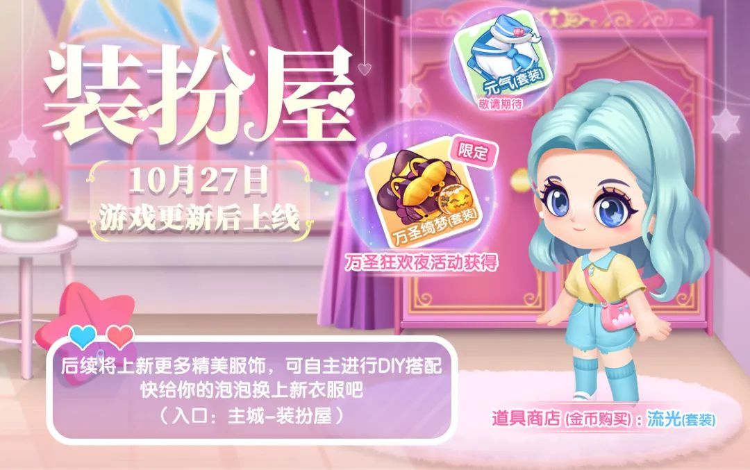 后续装扮屋内会增添更多装扮好物,更有多款配饰、发型、鞋子等装扮单品随心搭配,实现自主DIY装扮,打造全新泡泡换装体验。