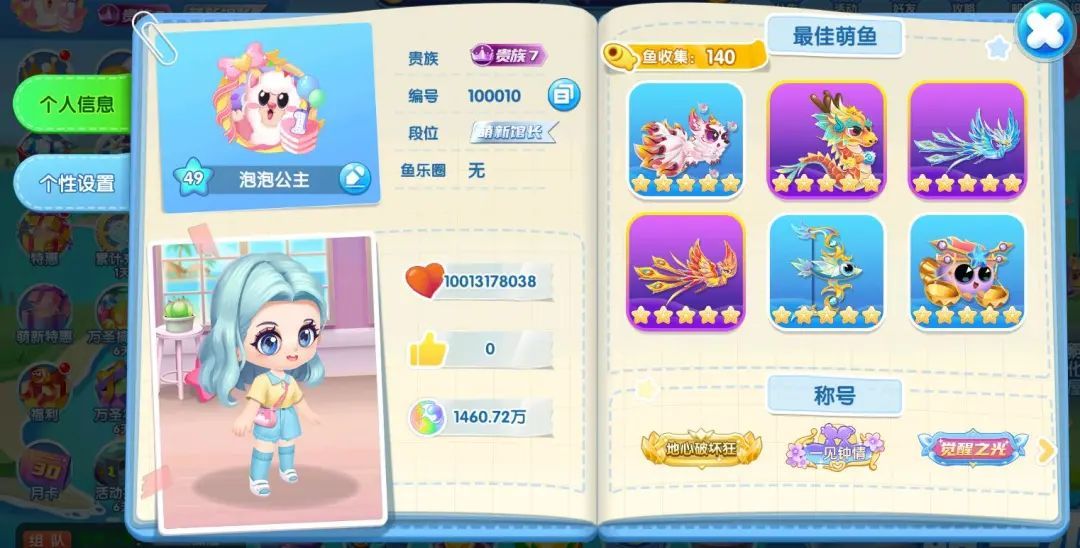 个人信息页展示全面升级,在里面馆长的最佳萌鱼、有趣头像框、引以为傲的称号和泡泡的新装扮通通都能展示,属于馆长的荣耀当然要给小伙伴们都看看!有个性的展示页面可以让鱼友们都牢牢记住你哦~