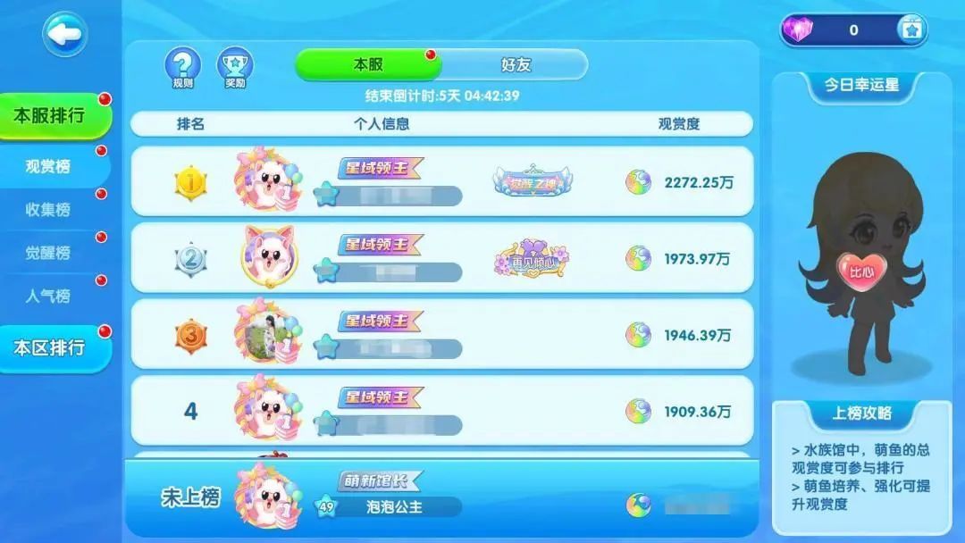 排行榜界面全新优化调整,馆长可在各个榜单前10名玩家随机比心1名,并获得钻石奖励!另外新增全区排行榜,快用比心表达对排行榜大佬的喜爱啦~