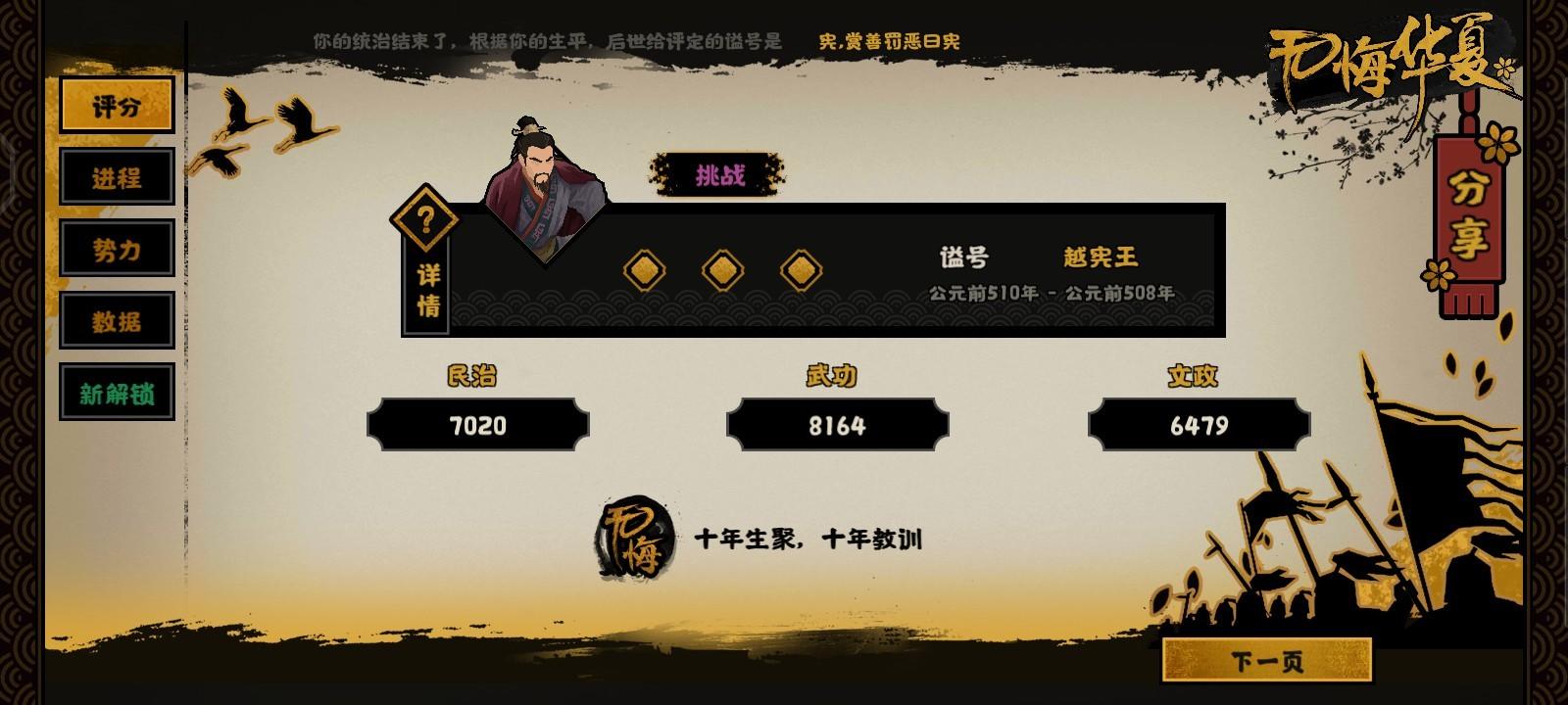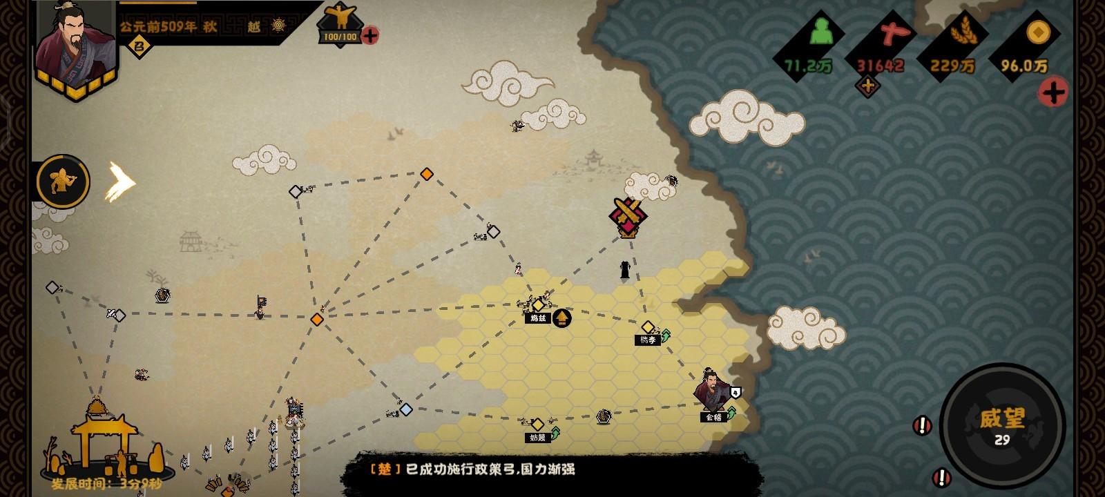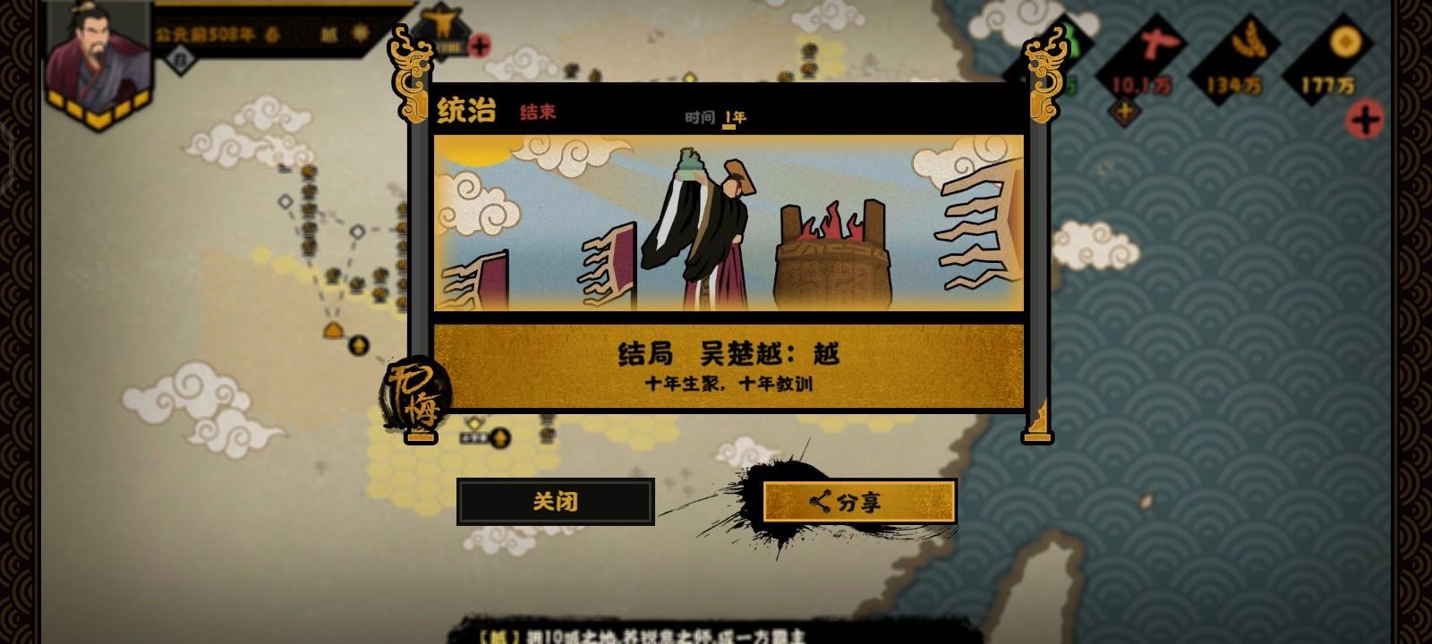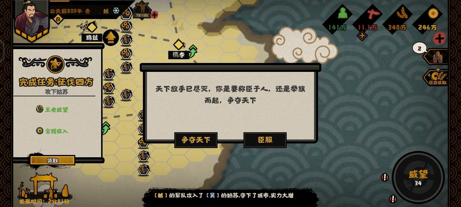 决战胜利后会问你臣服还是争霸,这里有两个结局,用越(楚)臣服楚(越)则触发联楚制吴,不臣服咱们则是走统一结局