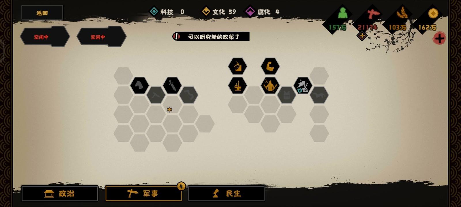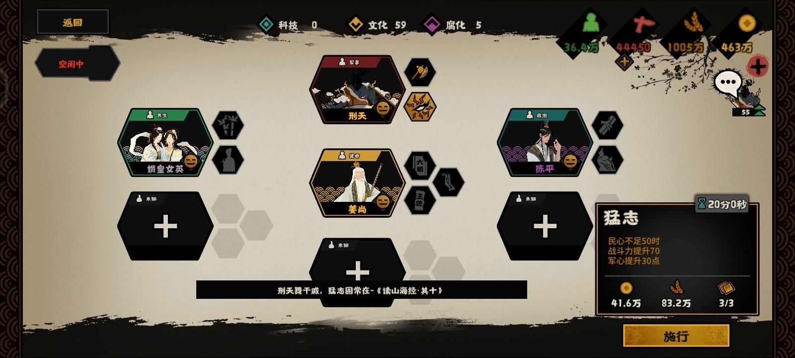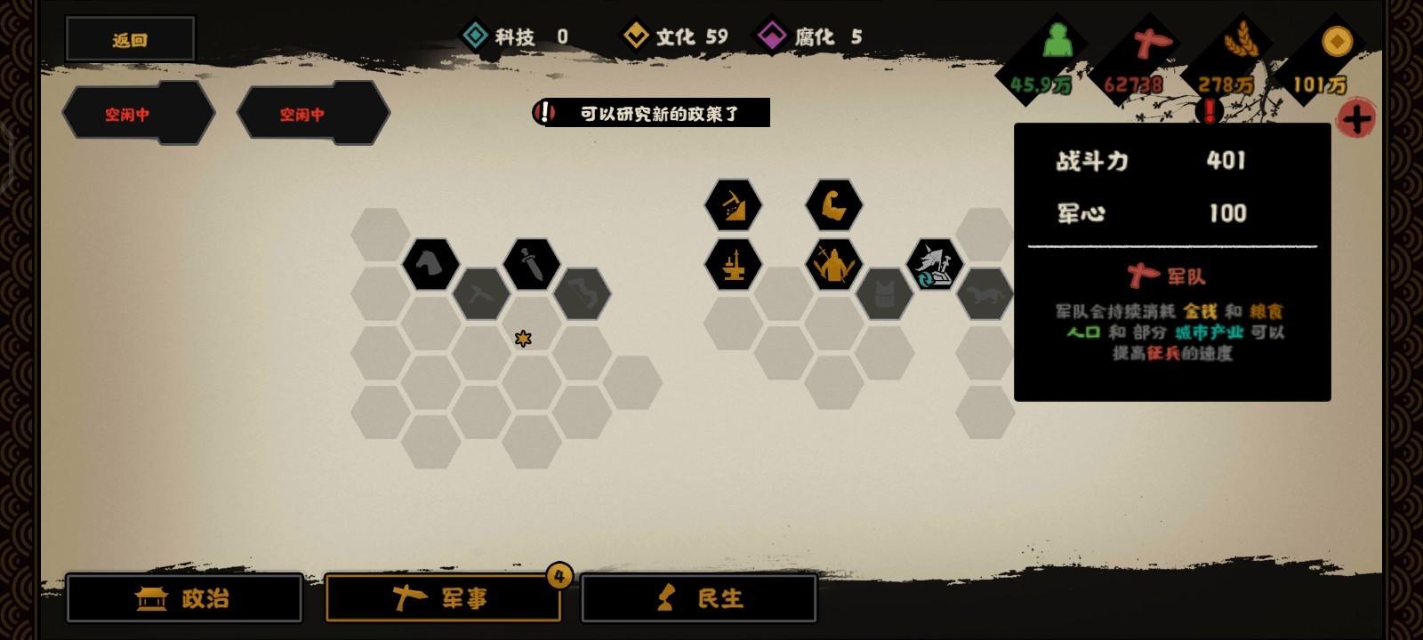 顺便点了军事科技里面的这四个战力和姜尚的一技能政策,点完后战力直接401(但是后面我不知道为什么变成398,可能是数据问题)