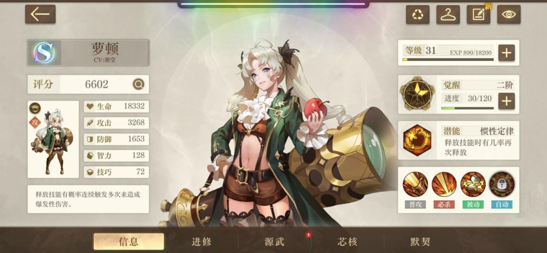 一阶效果:被动效果增添了自动技能,机械苹果也将列入有25%概率额外释放,与改造原则想对应,有概率额外触发自动技能,打出三秒眩晕