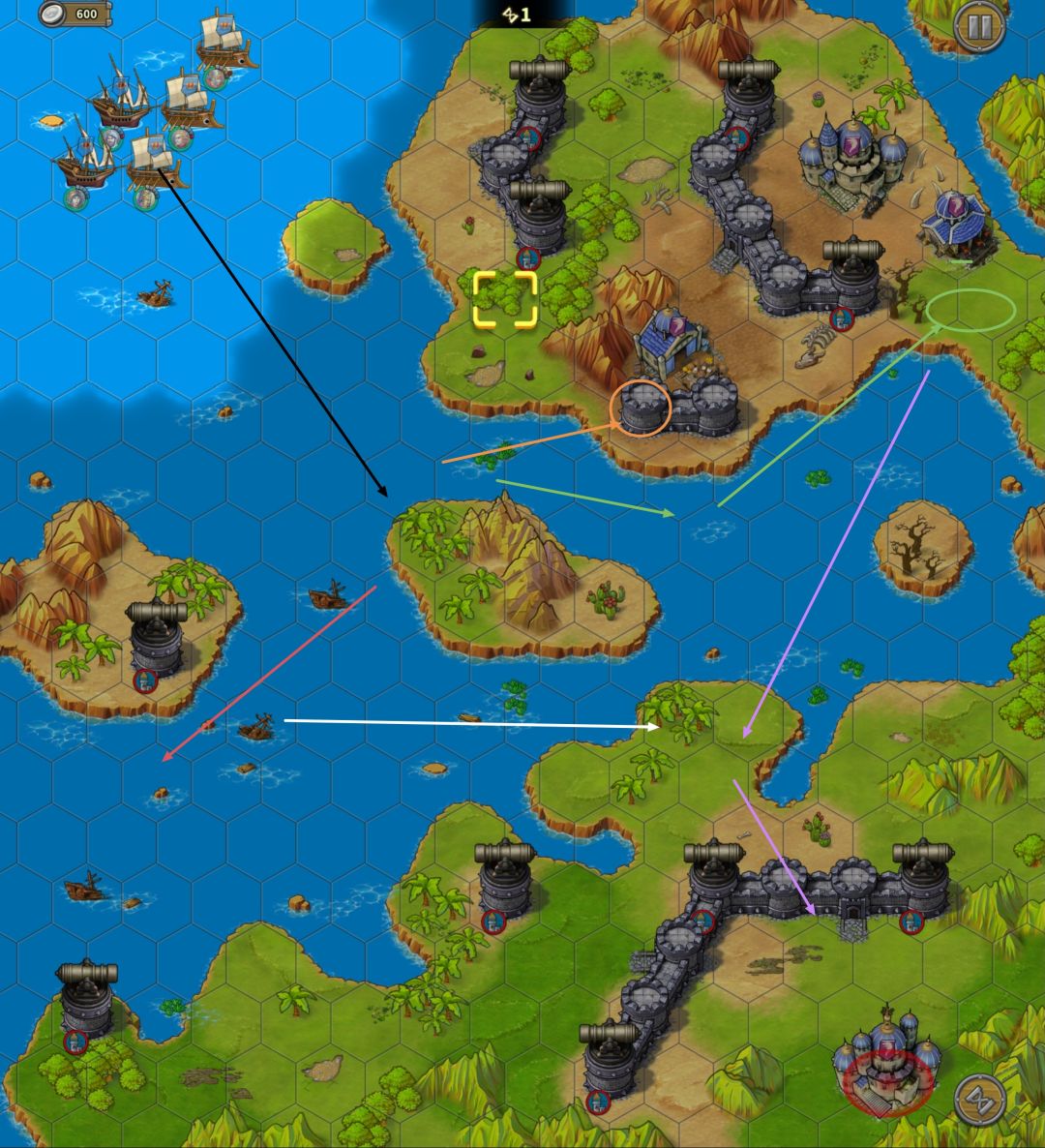大部队在第1,2回合走黑线,第一回合贝利撒留把公主放出来,注意不要放在陆上也不要挡路,否则重开。3回合后,贝利神列公主走红线去打蛇,鸭梨走黄线上岸,艳后哈立德走绿线上岸,在解决完上路海拉和城堡之后公主走白线去右下,鸭梨艳后哈立德走紫线。