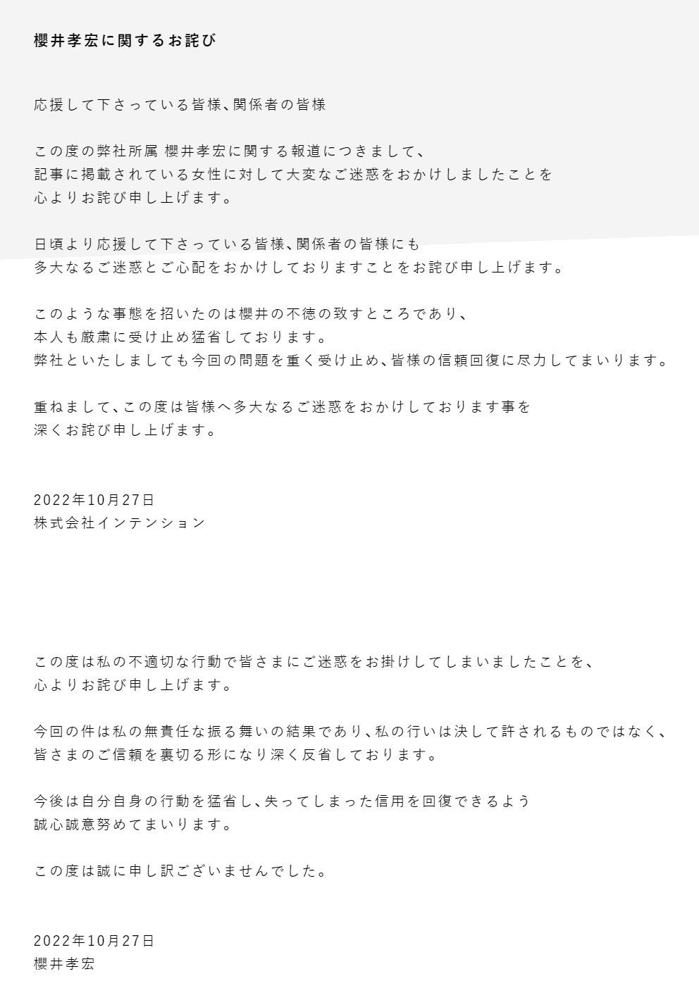 “给报道中的女性带来极大的不便十分抱歉,对平日支持事务所的各位和相关人士带来困扰十分抱歉”。“我犯下不容原谅的错误,对此进行深刻反思。今后将严肃自省,力争重获信任。”