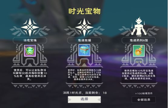 进入新的关卡后都会让你选择一个道具你可以根据需求来进行挑选或者不选择选择道具是会消耗时光点