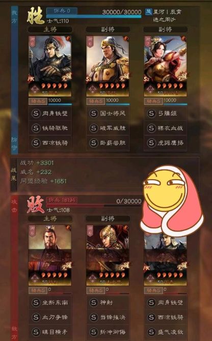 3W满兵满红吴骑互怼,最终吴骑凭借先手和稳定的输出爆发成功把对面给秒了!比起传统带盛气完美缴械孙权和太史慈的玩法来说,这套可谓是暴力拉满,盛气还可以留给青州兵使用。