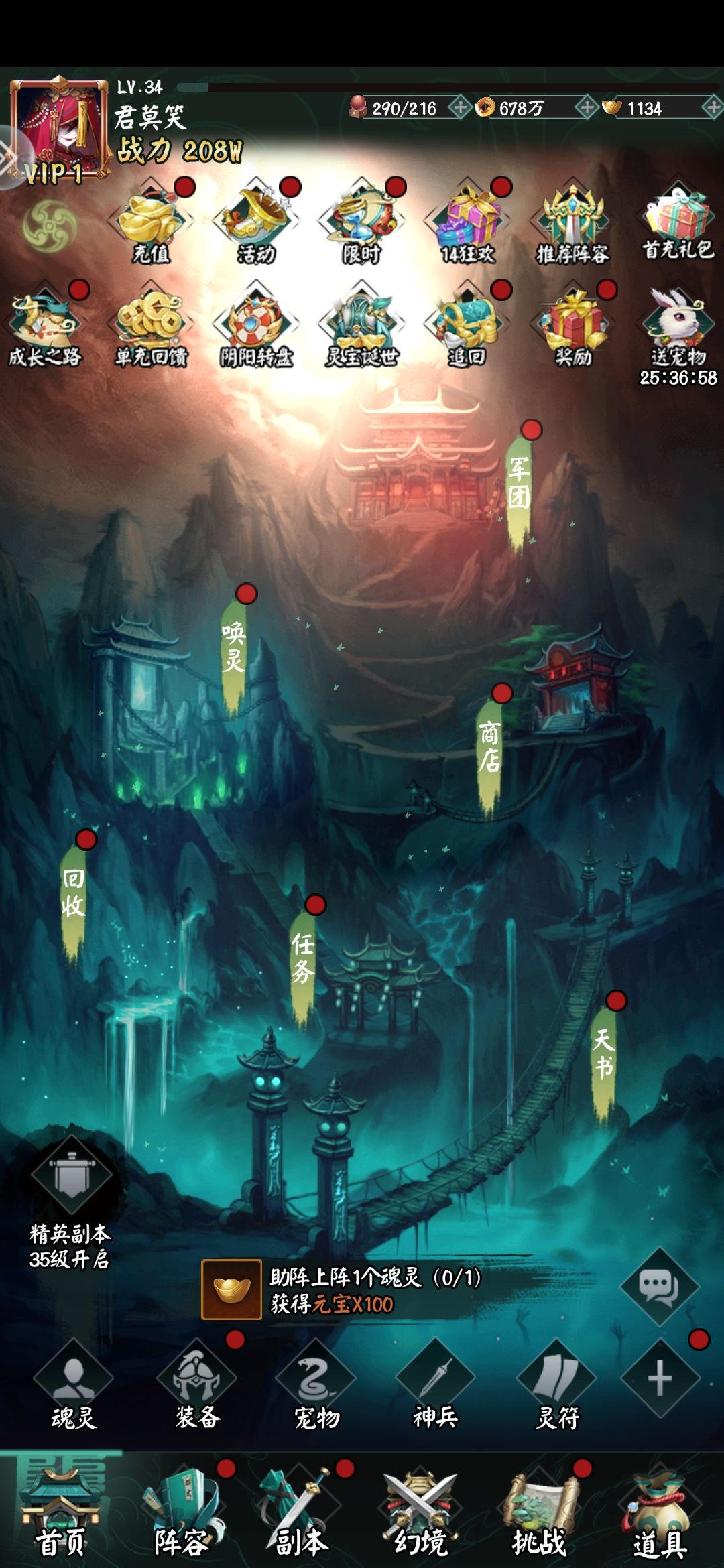 拿上面的图说说,点击“唤灵”,第一个一天可白嫖N次(对萌新来说很友好),下面的唤灵高级一些,唤个一百次(不难,通关副本到一定星即可点击“送百抽”领取)准能出个红色魂灵来。