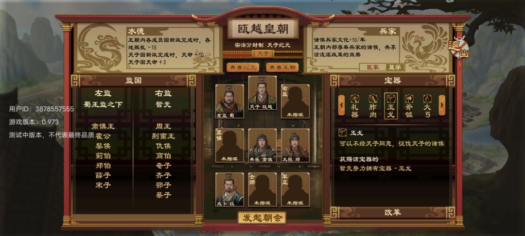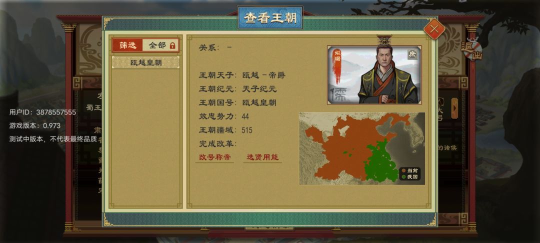 城池到达65或者100后会有大臣建议建立王朝,这是就可以建立自己的王朝了,建立王朝就可以有两个不用到达195个城池才能称帝的方法,第一,僭越提升爵位称帝,这个不建议使用,会被全国叛心百分之百,然后叛军出现,第二,召集王朝朝会可以选择称帝,附庸国绝大部分同意就可以称帝,就算不同意也可以一意孤行继续称帝。