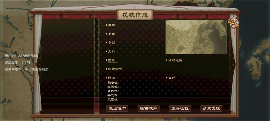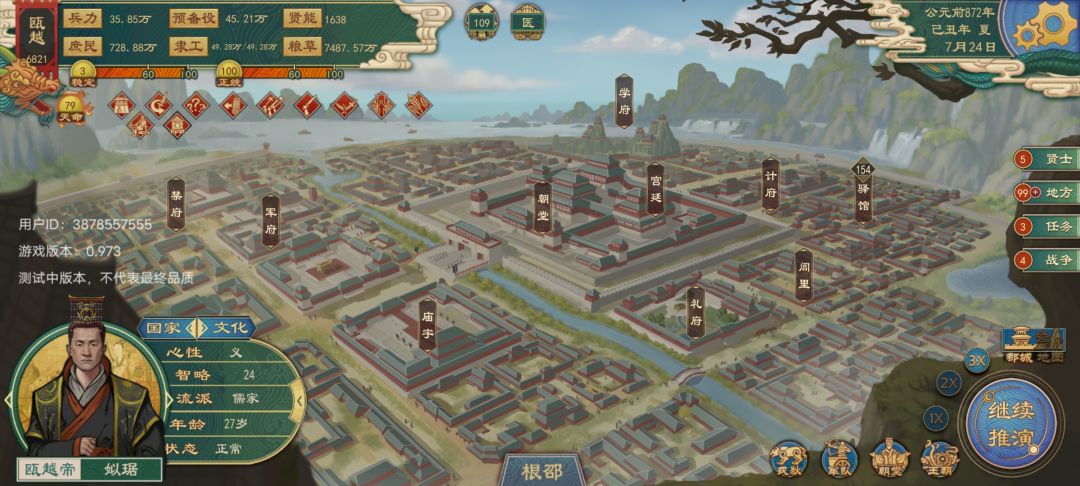 开局流派我一般选择兵家,对于军队战力可以提升到148,这游戏对军队战力的具体作用有点成谜但还是选的兵家心里看着稳,至于税率因为联姻取得的城池差不多可以到两到三个,人口也有一两万人,这是就可以实行泰半只赋,泰半之赋有个明显的效果就是城池人口会慢慢减少,但税收多。至于人口减少可以用后面说到的以战养战。