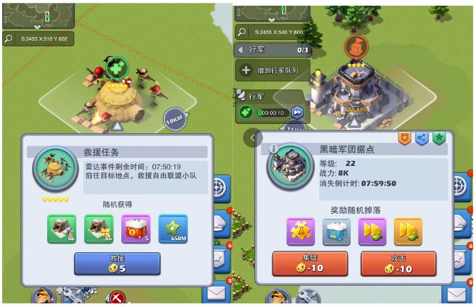 围剿黑暗军团奖励有强化箱子、金币箱子等,消耗10体力解锁,再根据星级消耗体力完成打野任务。此类任务建议刷满后一起完成,完成一个,点掉一个,让任务补充进来,如有此类任务继续一起完成,比较省体力(奖励金碎和钻石必打,其他的在体力不够的情况下缺啥打啥,体力多就看个人随便打)。