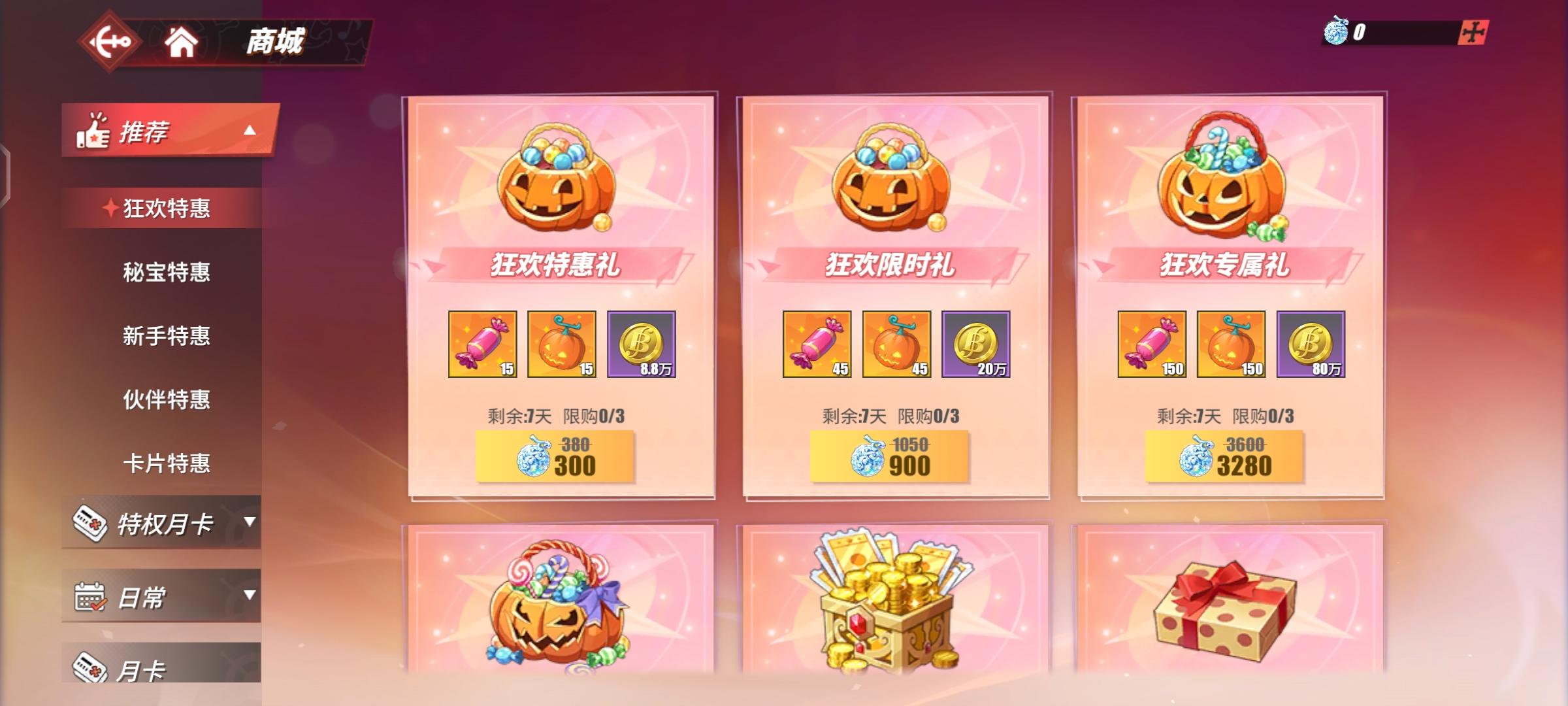 除去通过活动获得的南瓜灯和糖果之外,也可以前往商城购买狂欢礼包获得大量的糖果和南瓜灯。(这个的话,对于一般玩家来说,四舍五入相当于没有。)