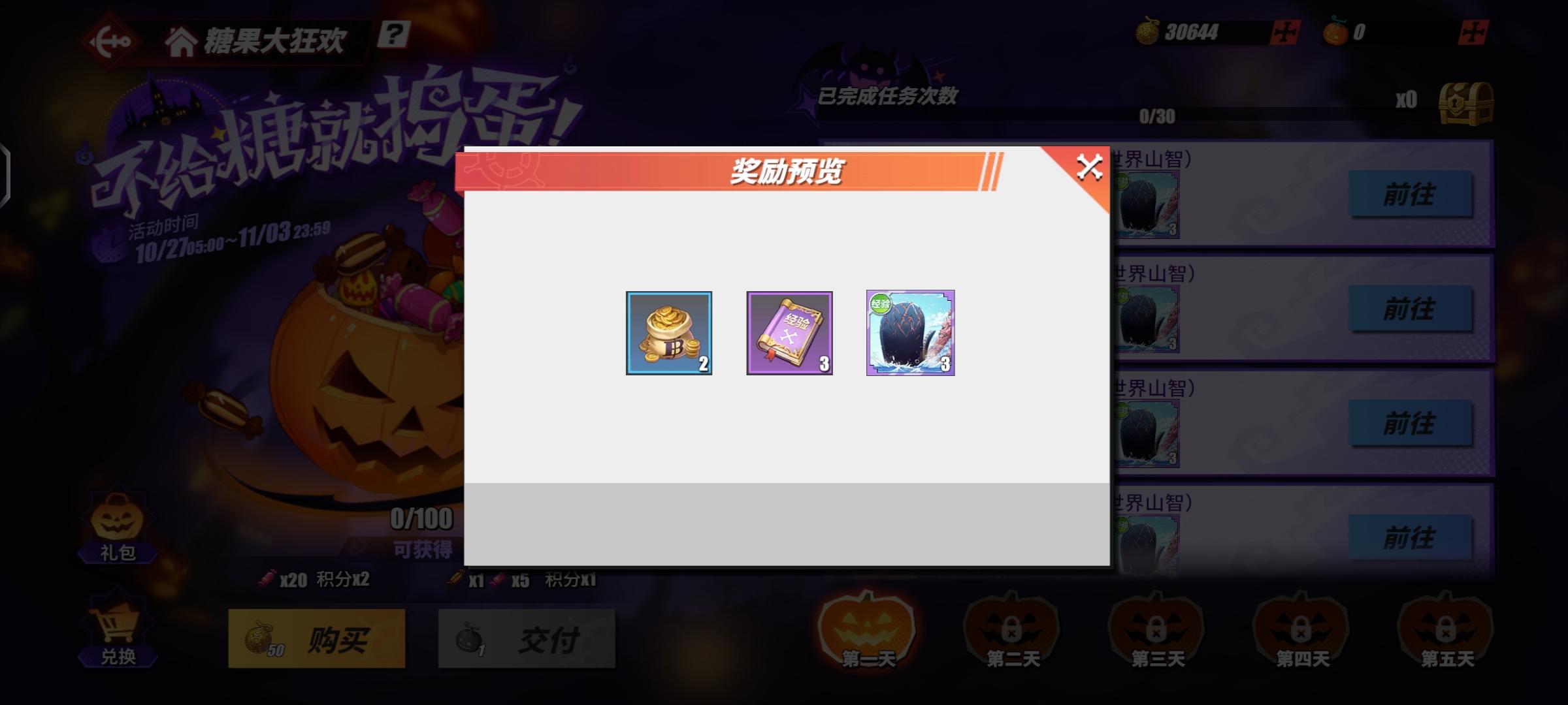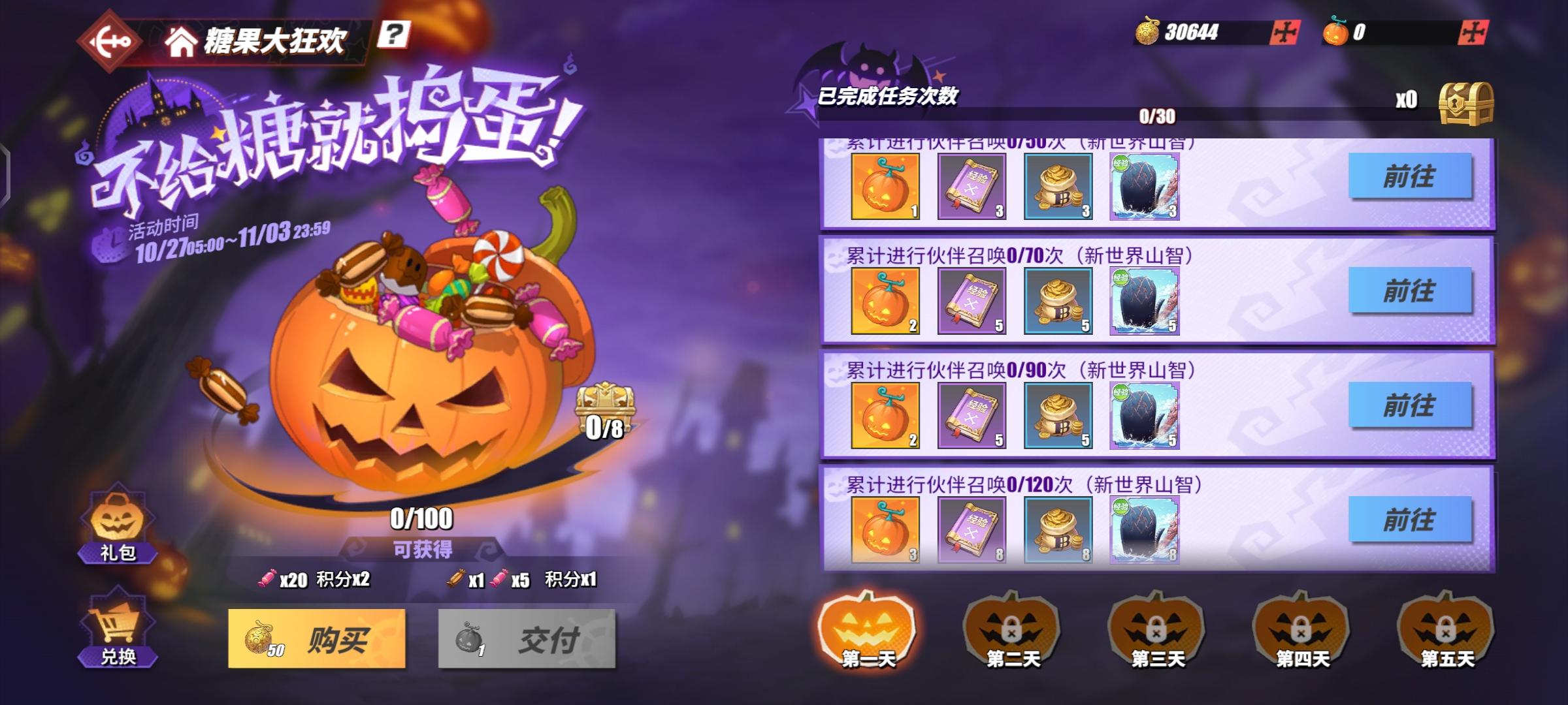 第一天的任务是新世界山智限定卡池的累计召唤次数,分别为10次、30次、50次、70次、90次和120次,共可以获得10个南瓜灯。这个任务还是比较简单的,不过简单是简单,能不能全部完成拿到就不一定了。