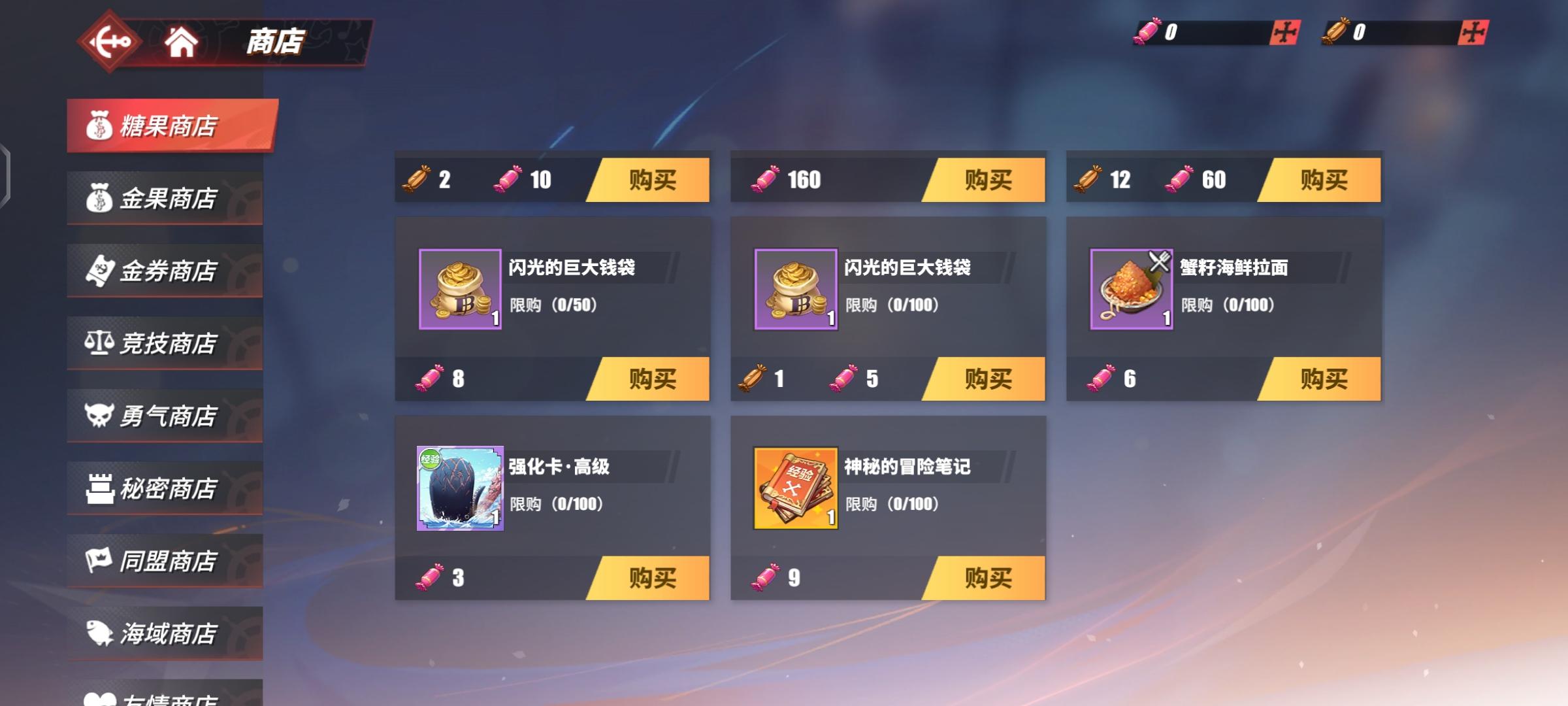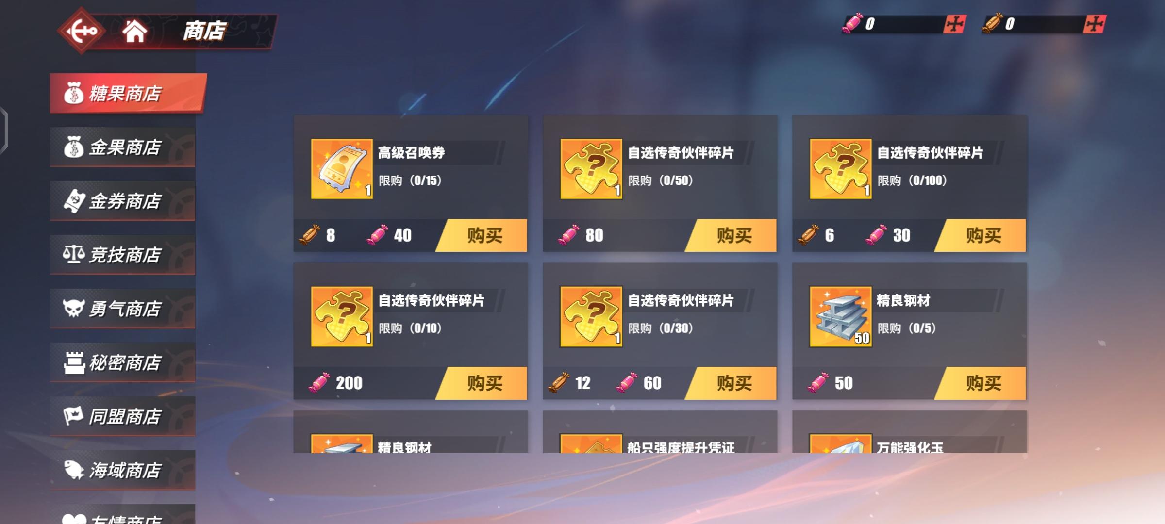 草莓糖果和巧克力糖果可前往糖果商店兑换道具。这一次的活动兑换商店可以说是有史以来最丰富的一次了,光高级召唤券就有15张,另外还有大量的自选传奇伙伴碎片、钢材、凭证和特级洗练药水等。