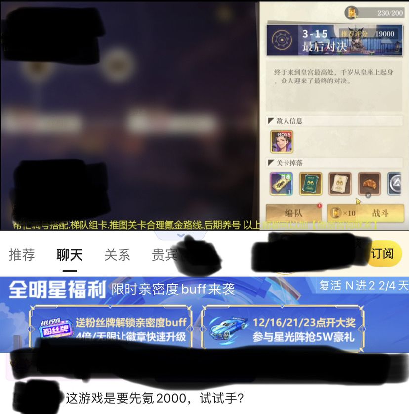 2.体力尽量三次都拿,非常缺体力,体力药剂基本攒不起来,即使每天的体力和药剂加起来根本不够用。副本和关卡扫荡一遍体力就没,而且主线任务一定会卡关。我知道你很急,但是你先别急。扫荡副本拿材料,给角色升级升阶觉醒。寄,体力不够用。(没钱氪金买体力,建议快run)好的,我也急了。