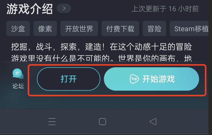 如果你只有一个开始按钮,也不要惊慌。这应当是TapTap版本差异导致的。在更新完成后,只要按照之前的路径,重新将游戏安装到本地就可以了。安装的方式如下: