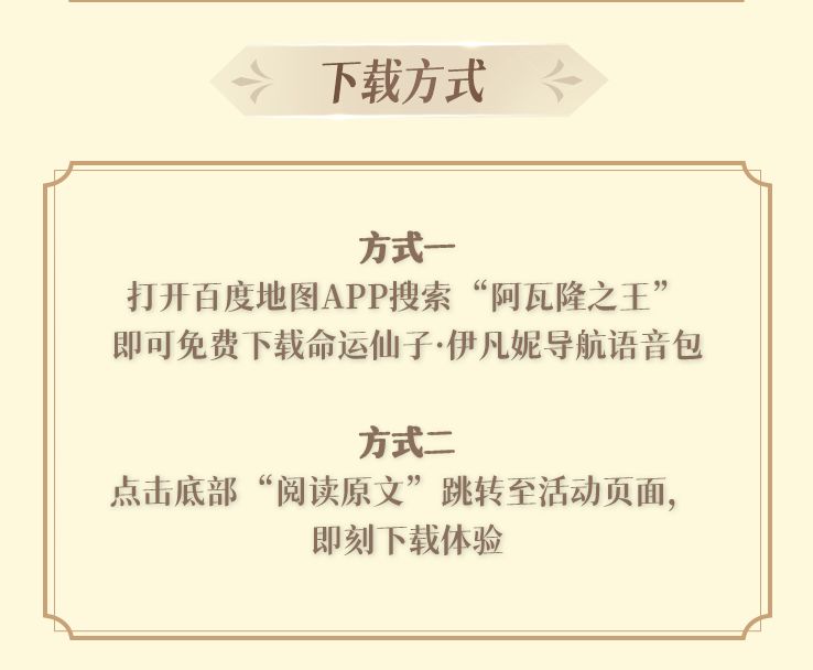 百度地图导航语音包上线啦!命运仙子·伊凡妮将在百度地图为您带来个性化的场景互动,亲切的语音指引,一路伴您同行。即日起,打开百度地图APP,搜索“阿瓦隆之王”,即可免费下载【命运仙子·伊凡妮导航语音包】。一起出发吧!