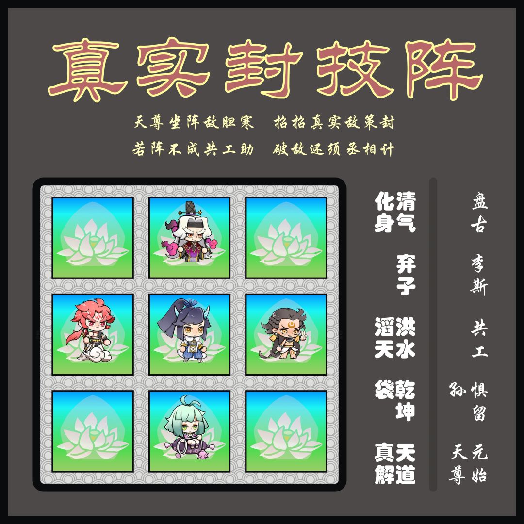 真实封技阵是围绕元始天尊的奥义“仙锁”(敌人受到真实伤害概率被封技)为核心做文章,配合若干带群体真伤的仙人来触发该核心。比如: