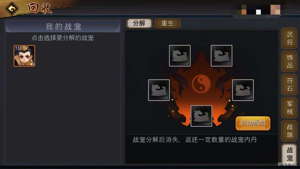 长远规划:从普通平民玩家的角度来看(土豪请随意),如果此前已经着重养成了几头同样品阶的橙宠,那么这时候还想大力“栽培”阿布的话,拆东墙补西墙式分解、重生其它橙宠来养成阿布,显然是不可取的行为。因为每一个橙宠的获得都来之不易,哪怕是免费射箭抽中的。因此,最好给养成阿布做一个阶段性的长期养成规划,按照规划循序渐进,为他的觉醒变异提前“铺路”。