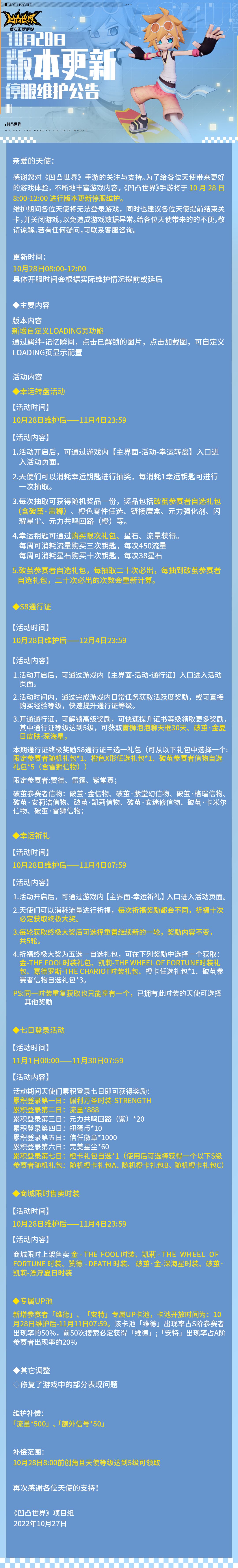 感谢您对《凹凸世界》手游的关注与支持。为了给各位天使带来更好的游戏体验,不断地丰富游戏内容,《凹凸世界》手游将于10月28日8:00-12:00进行版本更新停服维护。
