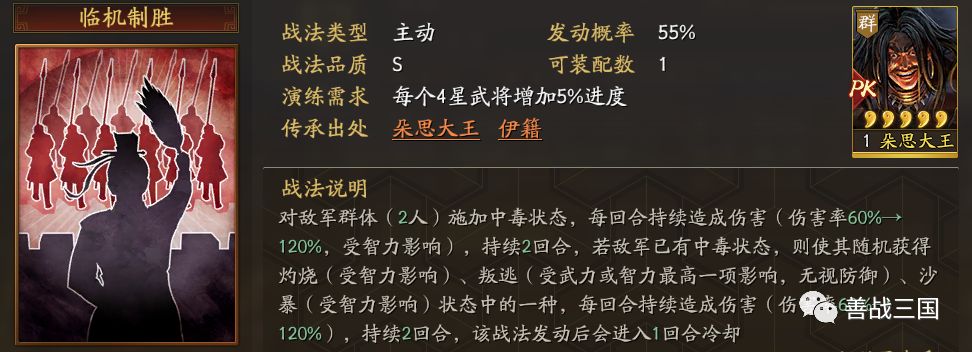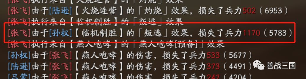 临机制胜:毒、火、沙三种持续伤害,都受智力影响,如果效果是溃逃(受武力影响)的好,那这战法强度就会偏弱,将会和叛逃相差一个级别的伤害,同时很难找到合适的武将搭配。所以说【临机制胜】强的原因之一就是这个叛逃有无视防御的“破阵”效果
