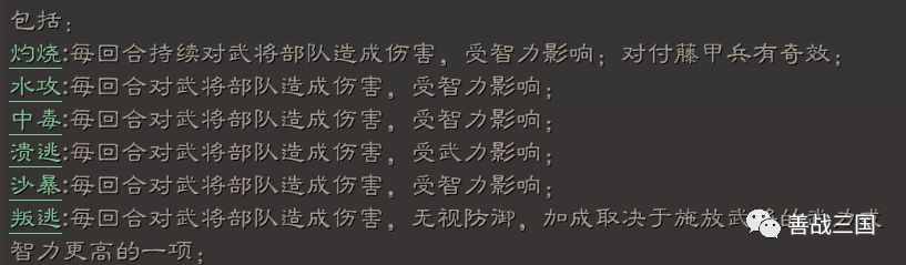 其中受智力影响的有:灼烧、中毒、沙暴、水攻;受武力影响的有:溃逃;无视防御的有:叛逃