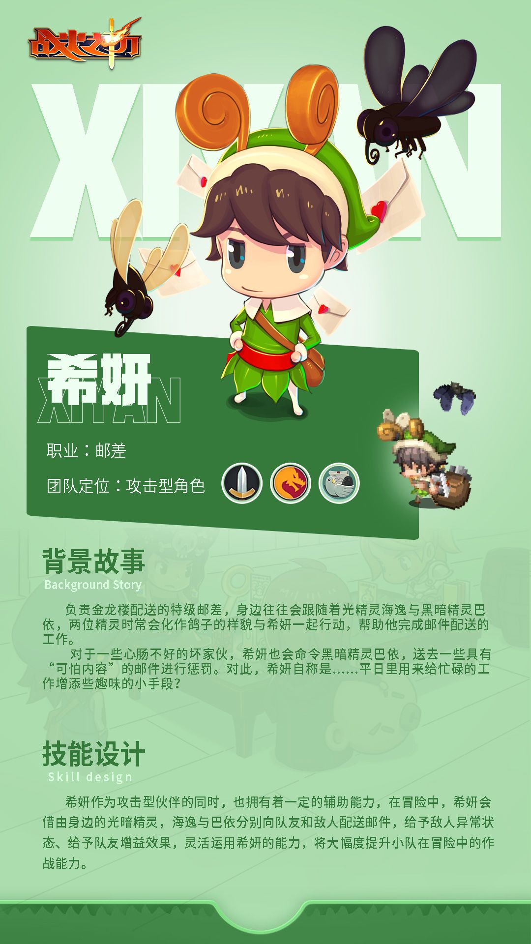 希妍作为攻击型伙伴的同时,也拥有着一定的辅助能力,在冒险中,希妍会借由身边的光暗精灵,海逸与巴依,分别向队友和敌人配送邮件,给予敌人异常状态、给予队友增益效果,灵活运用希妍的能力,将大幅度提升小队在冒险中的作战能力。