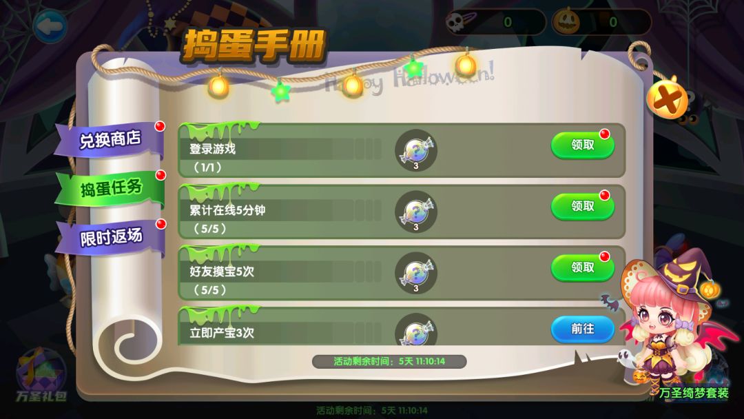 节日的仪式感从翻阅捣蛋手册开始,馆长在捣蛋任务中,完成相应任务即可领取糖果,将糖果赠予泡泡女巫获得捣蛋南瓜和小鬼发夹道具!