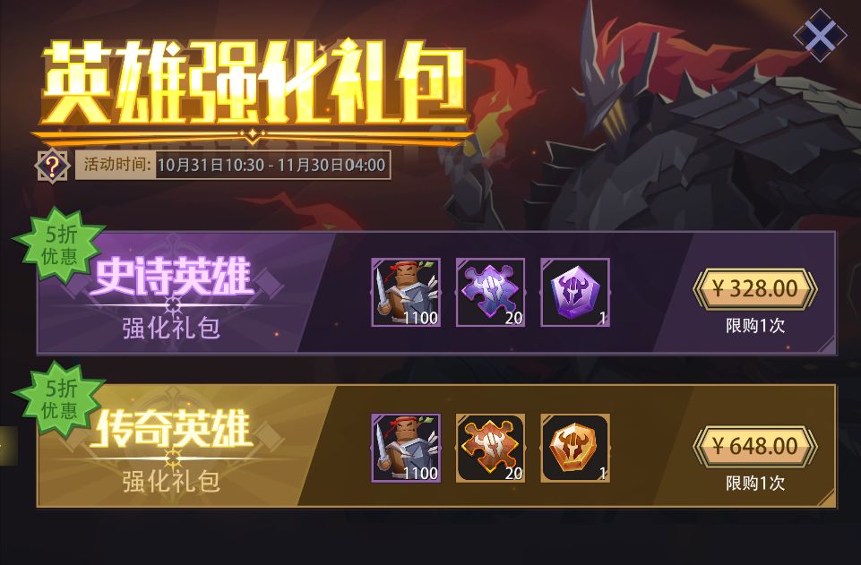 活动内容:活动期间,开放[史诗英雄强化礼包]与[传奇英雄强化礼包]两种;每种礼包仅可购买一次。(该礼包改为活动期间限时开放购买)