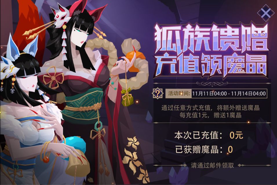 活动内容:狐族姐妹花来临,与你共度狂欢。活动期间,通过任意方式充值任意金额,都会额外赠送魔晶。每充值1元,赠送1魔晶;赠送无上限。充值成功后,赠送的魔晶会立即通过邮件发放,请及时领取奖励。