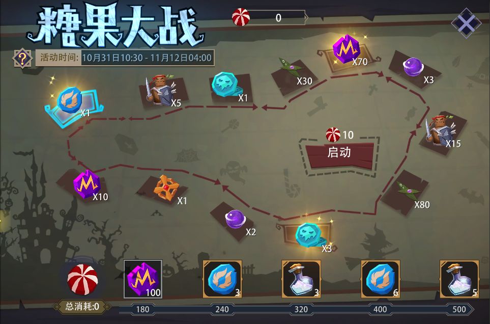 活动内容:活动期间,可消耗固定数量的‘糖果’来启动游戏,获得奖励。每日无次数限制。累计消耗‘糖果’达到下方进度条所示数量,还能领取额外奖励。