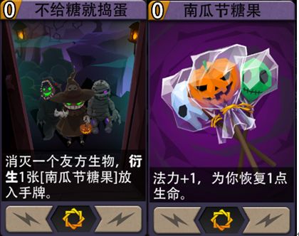 不给糖就捣蛋:暗系特殊魔法卡,0费,消灭一个友方生物,衍生1张[南瓜节糖果]放入手牌。