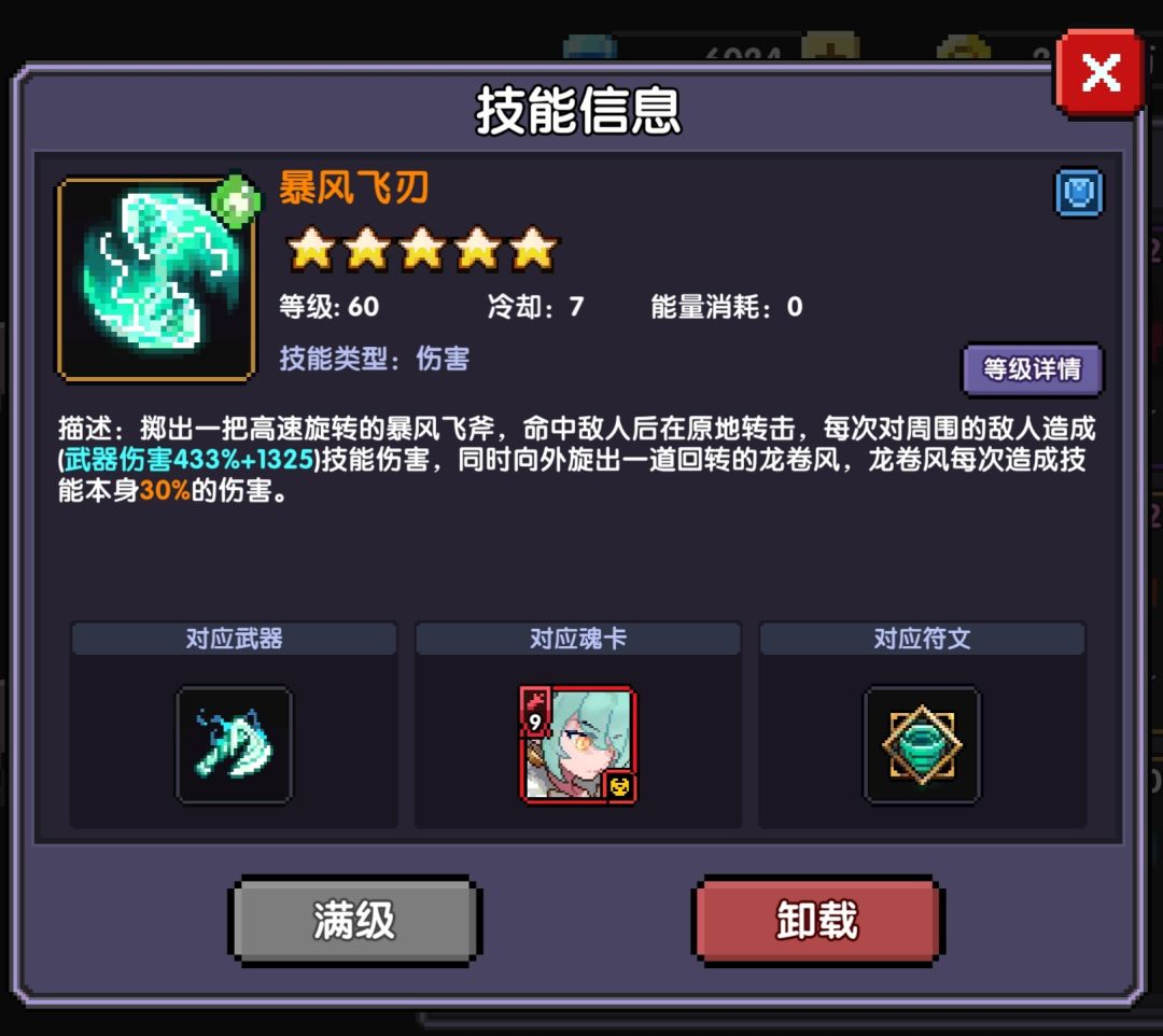 核心输出技能,必满,注意⚠️!这个技能会在碰到第一个敌人后停止移动,开始原地旋转并甩出一道小风,小风在碰到墙壁时会反弹,所以对群和快速移动的boss时需要贴脸进行攻击,而且在墙角时反弹小风使伤害可以提高一点点(好像在哪里见过呢?)