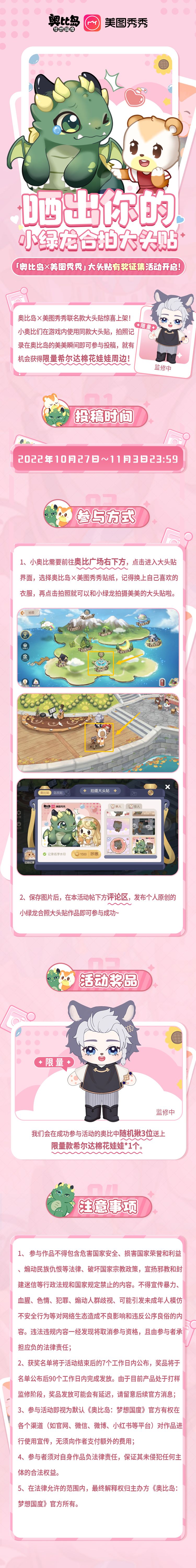 各位奥比自拍达人们看这里!「奥比岛×美图秀秀」大头贴有奖征集活动开启!晒出你的小绿龙合拍大头贴赢「希尔达棉花娃娃周边」~