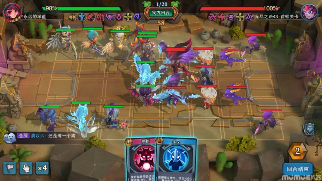 对局:老马站在左上角,必吃第一下狙击,然后老马会走到第三列,老马召唤的小妹会在老马的身后,必吃第二发狙击,属于给老马挡子弹了,可歌可泣啊~始祖第一回合给小树人上标记,雪风加始祖攻击如果能给蕾娜加到恐惧,萨菲大概率不死