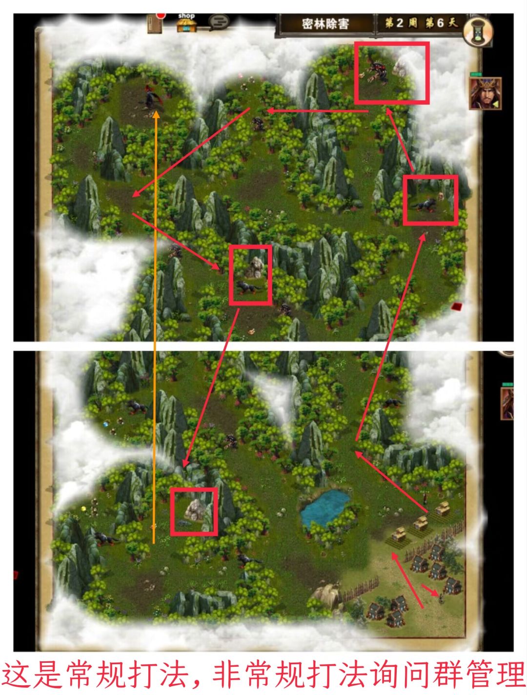 开局对话农民提示3周内过关(3周7天),占3座农田。一路火扇扇小兵无压力,如果血低了可以最后剩一队敌人不打死,利用吕蒙被动技能放风筝回满血。图中有3处招兵的地点,都去招了。最好打路上小怪的时候保持无损。打最后boss,我招了6只夕兽分4组,狼100只,狼王40只。