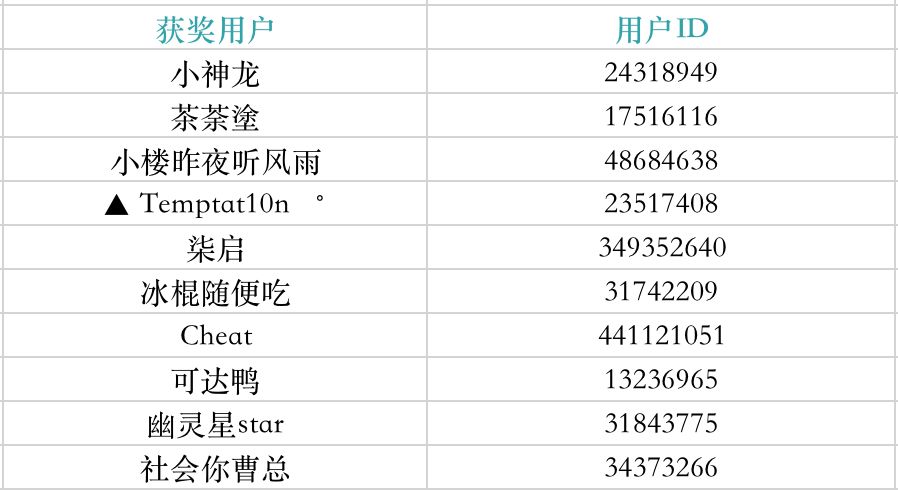 由于参与人数有限,本活动将全部发放50元京东卡。恭喜以下玩家获得50元京东卡,请注意查收站内信小铃铛发放的卡密哦!
