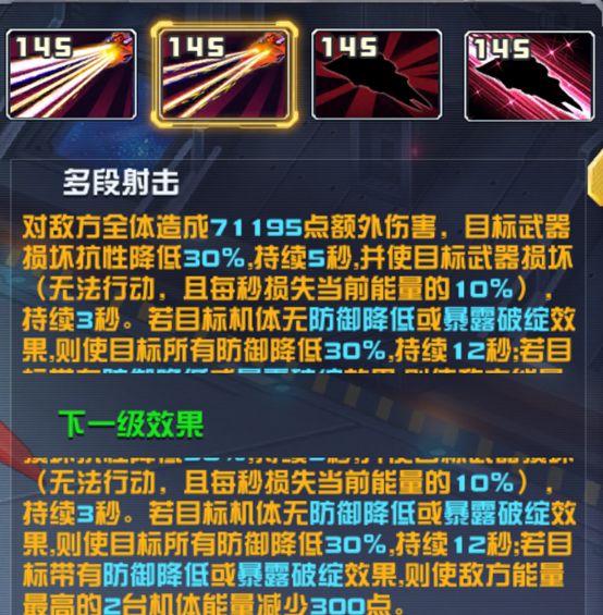 对敌方全体造成71195点额外伤害,目标武器损坏抗性降低30%,持续5秒,并使目标武器损坏(无法行动,且每秒损失当前能量的10%),持续3秒。若目标机体无防御降低或暴露破绽效果,则使所有防御降低30%,持续12秒;若目标带有防御降低或暴露破绽效果,则使敌方能量最高的2台机体能量减少300点。