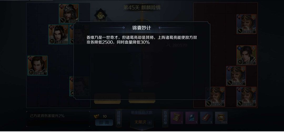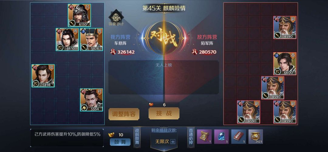 在挑战页面可以查看到敌方阵营和战力,我方可根据敌方阵营调整阵容,若战力相差较小,建议多更换阵容进行挑战,也可花费10元宝进行鼓舞,调整属性,或购买锦囊妙计,收获意想不到的效果。