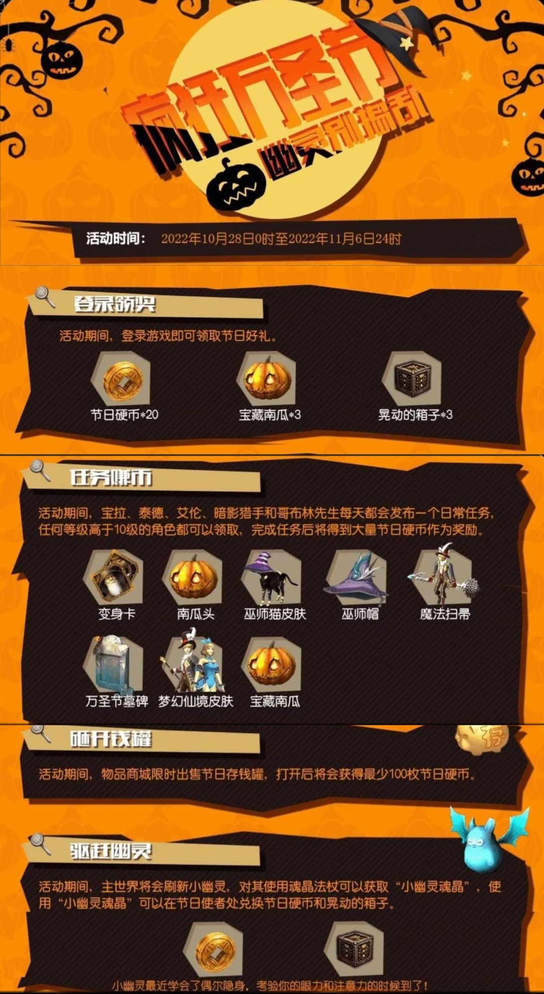 本次万圣节活动按照以往,少了觅宝活动,并增加了小精灵魂晶抓捕难度。但还是祝福大家能获得自己想要的物品,祝游戏愉快~