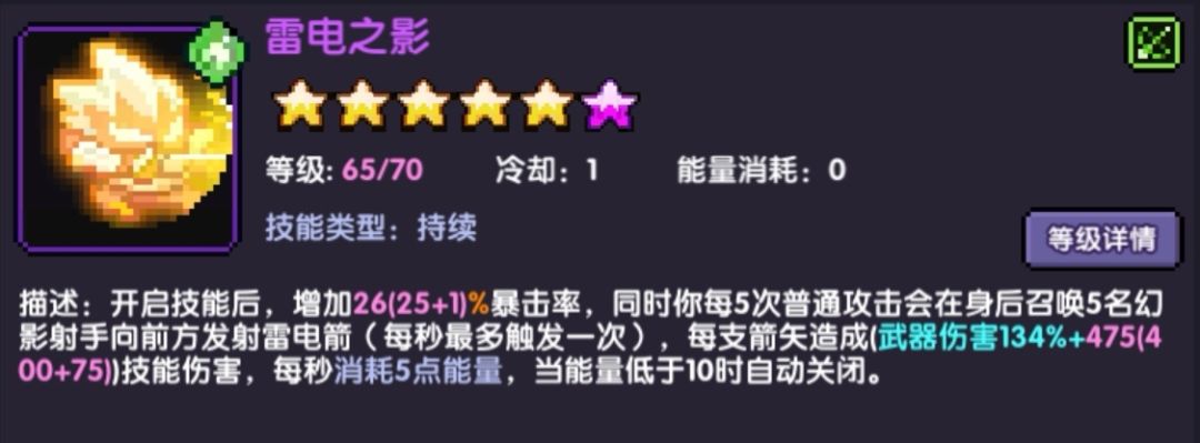 雷电之影:满级后开启技能可以给你提供25%的暴击率,(给我们的暴击值需求减轻了很多),每普攻五次会召唤五个小弟在后面帮你滋一下伤害(每秒最多触发一次)。